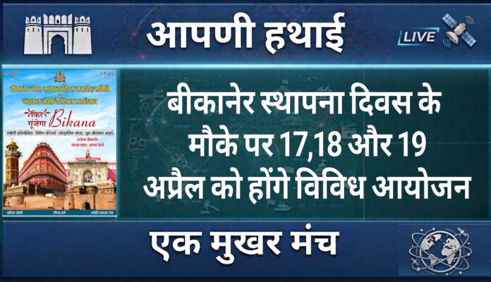 आपणी हथाई न्यूज, नगर स्थापना दिवस इस बार नए अंदाज और व्यापक स्वरूप में 17, 18 और 19 अप्रैल को मनाया जाएगा। बीकानेर नगर स्थापना दिवस समारोह समिति और नंदलाल जोशी चैरिटेबल फाउंडेशन के संयुक्त तत्वावधान में आयोजित होने वाले इस तीन दिवसीय कार्यक्रम की तैयारियां पूरी कर ली गई हैं। समिति के अध्यक्ष के रूप में संभागीय आयुक्त विश्राम मीणा होंगे