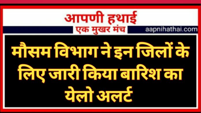 आपणी हथाई Weather न्यूज कमजोर होते मानसून के बीच मौसम विभाग ने आगामी तीन घंटों के लिए एक दर्जन से ज्यादा जिलों के लिए बारिश का येलो अलर्ट जारी किया है। मौसम विभाग के अनुसार आगामी तीन घंटों में सीकर, जयपुर, भरतपुर, धौलपुर,अलवर करौली नागौर, सवाईमाधोपुर, कोटा, टोंक, बूंदी चित्तौड़गढ़ अजमेर, भीलवाड़ा जिलों तथा आसपास के क्षेत्रों में कहीं-कहीं पर मेघगर्जन के साथ हल्की वर्षा /आकाशीय बिजली और तेज़ हवा (20-30 kmph) चलने की संभावना है ।