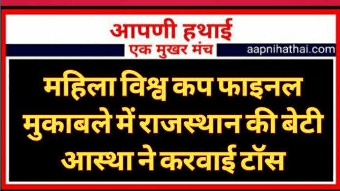 आपणी हथाई Sports न्यूज,महिला विश्वकप के फाइनल मुकाबले में आज भारत और अफ्रीका की टीम के बीच मुकाबला हो रहा है। इस मैच में राजस्थान की बेटी आस्था अग्रवाल ने टॉस कराया। राजस्थान के अजमेर जिले की निवासी आस्था गूगल कंपनी के गूगल-पे की मार्केटिंग मैनेजर हैं। गूगल-पे कंपनी महिला क्रिकेट वर्ल्ड कप की स्पोंसर है। इस कारण आस्था को टूर्नामेंट की पूरी जिम्मेदारी दी गई। आपको बता दें आस्था अलवर बिजनेसमैन रवि अग्रवाल की बेटी हैं। रविवार को टॉस के दौरान अलवर में आस्था के घर पर उत्साह नजर आया।